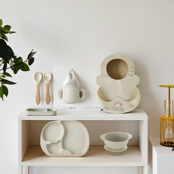 Venta al por mayor de platos de silicona de grado alimenticio sin BPA para bebés, vajilla con ventosas, baberos, cuchara, tenedores, juegos de suministros de alimentación para bebés